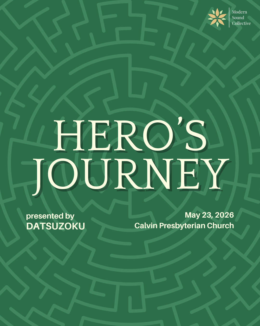 Hero’s Journey is a choral concert that tells a timeless story. Trials, transformation, and triumph are explored through song. Datsuzoku presents a program of choral works that follow the path from struggle to renewal, singing music of great intensity, vulnerability, and hope. This performance celebrates resilience and imagination, offering a moving tribute to the power of music to guide us through challenges toward answers and growth.